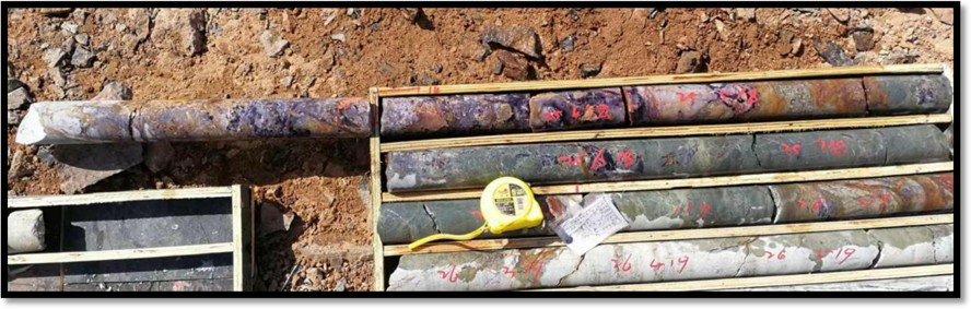 螢石礦體沿控礦斷裂構造呈似板狀、透鏡體或扁豆體分布。目前槽鉆探工程揭露控制的螢石成礦帶有 5 條,其中 1、4 和 6號礦體規模較大,沿走向控制長度分別為 800m、400m 和 450m,寬度在 0.3‐8m 之間。其余礦體長度在幾十米至100 多米之間不等。鉆孔揭露礦體最大延伸深度為 270 多米。